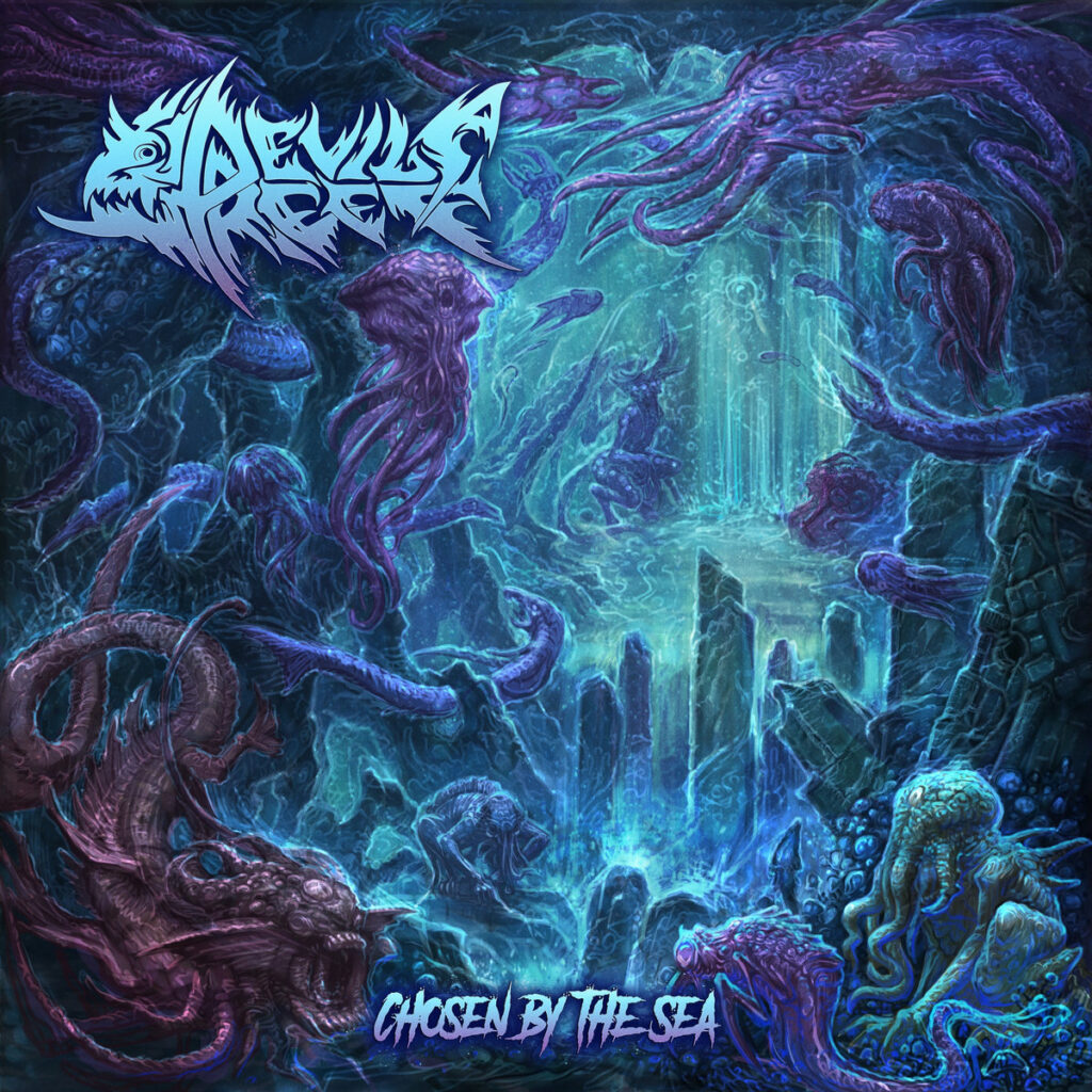 Devil’s Reef is a fresh-new tech death band from Frederick Maryland who have now put out their debut album Chosen by the Sea. This album caught my attention with its interestingly aquatic name, balancing wholesome marine life with Satan. All that is topped off with an admittedly creative band logo as well as a beautifully designed album cover. And on top of this, it’s combined with one of my favorite literary themes: cosmic horror. “Just my cup of tea”, I naturally said to myself as I admired the aesthetic of this band.