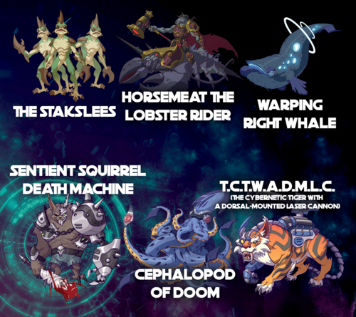 Before I go too much further into the music though, I want to give you a sense for the backstory that this band has created. Firstly, there’s an encyclopedia of characters from the multiverse. There are over 100 ILLUSTRATED characters, each with an explanation of their origins and characteristics. There are no fewer than seven cosmic squids in this database, mostly engineered from Earthly squids such as Watasenia scintillans or Onykia robusta, designed to be controlled in space battle by either Vampira Infernalis herself (engineer of both the Cosmic Squids and the Star Monkeys) or by the Cosmic Commander Squid. There are seven species of cosmic battle crabs too, though these, considered a failed experiment, were left to their own devices on the planet where they were engineered. This impressively fleshed out universe is referenced by both the band’s albums, and I presume will continue to grow alongside their discography.
