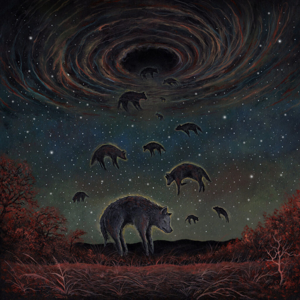 Absurdism is one of my favorite brands of artistry (and comedy), and the image of a wormhole abducting some poor wolves [Editor’s note: we had a whole discussion about whether they were wolves, coyotes or, as one person—I’m not going to name names—who has apparently never been to a farm suggested, wild boar] on such a beautiful art piece just absolutely sends me. I have so many questions. What’s a wormhole doing here? And why is it abducting only the wolves? The poor creatures are going to die of malnourishment. Wasn’t this album supposed to be about vampires? Do these animals represent some sort of spiritual essence to Unsouling that the wormhole feels is better suited elsewhere in the galaxy? Why are these wolves so damn chill about it? Isn’t this gonna mess up the local ecosystem? I guess we’ll never know, but at least we can make up for this wormhole’s antics by donating to the Wolf Conservation Center. Save the wolves, everyone.