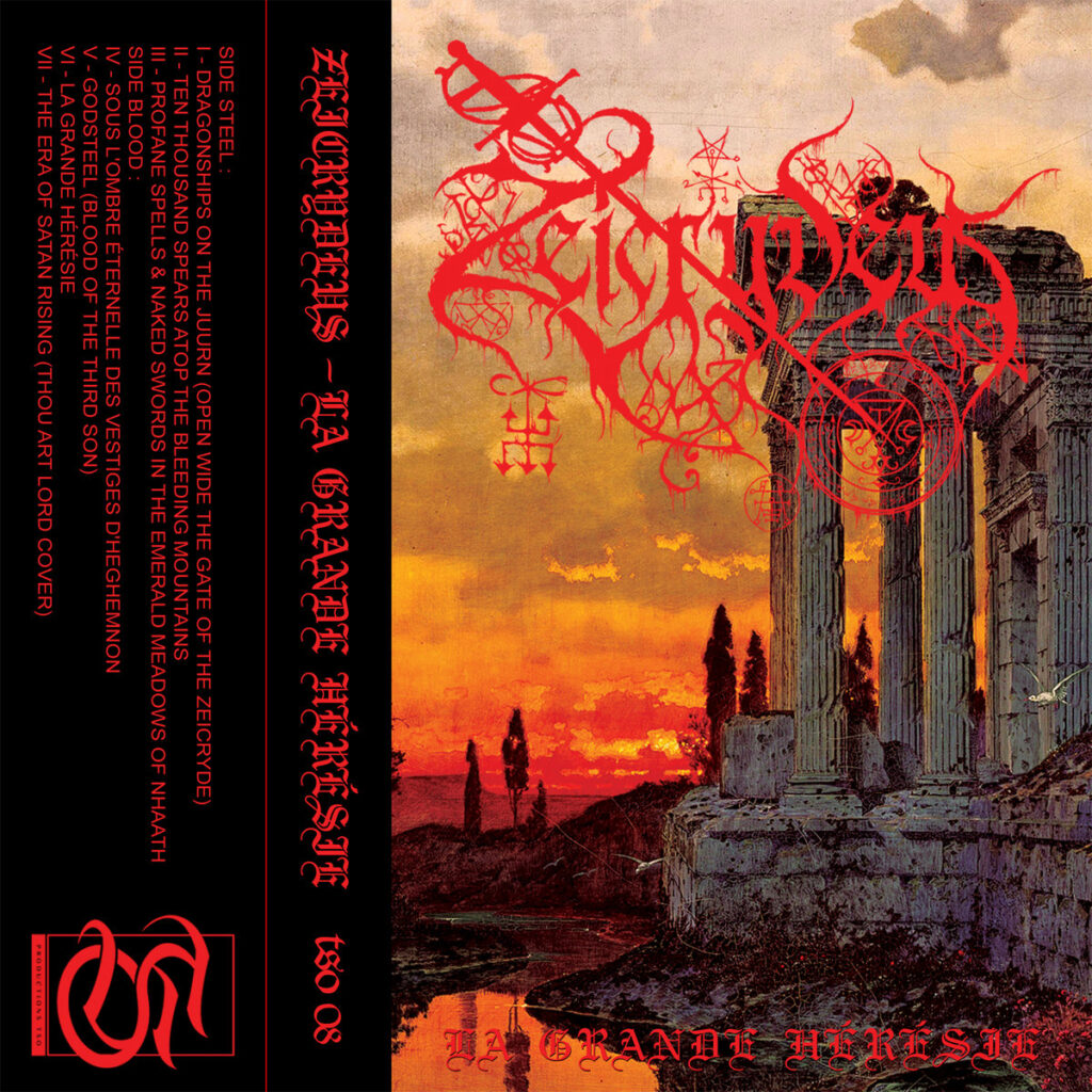Zeicrydeus is a solo project, with Tougas handling the manifold duties of four string lead bass, vocals, multi-timbral synthesizer, six string guitars, timpani, and drum programming. There are session live drums credited to Chakral (Ascended Dead, VoidCeremony), though I’m not exactly certain where they begin and the programmed drums end. Regardless, La Grande Heresie is a bold (and brash) statement of Tougas’ love for the Hellenic black metal scene, drawing direct inspiration from early Rotting Christ, Necromantia, and Varathron, and infusing this sound with a roaring heavy metal spirit. “Ten Thousand Spears Atop The Bleeding Mountains” fittingly kicks things off with a lyrical homage to Running Wild’s Under Jolly Roger, barreling into an instantly recognizable triumphant Tougas riff and showcasing our first Tougas Twist™: a metric shitload of pinch harmonics intertwined right in the middle of fearsome finger acrobatics. Once the high-octane display has run its course, we are introduced to the secondary style that comprises La Grande Heresie: swaggering Manowar-esque USPM riff-craft. The combination of melody driven black metal and scrappy DIY heavy metal aesthetic works wonderfully as a foundational sound whereby Tougas springboards his idiosyncratic stylings.